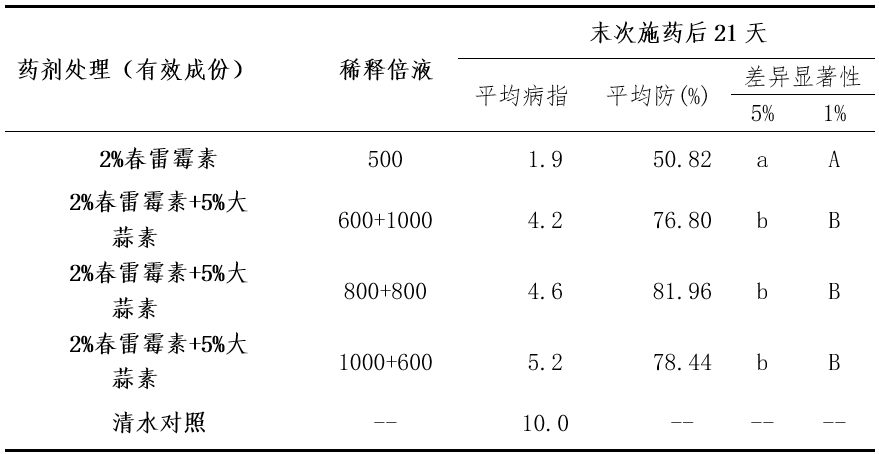 實驗結(jié)果通過Duncan’s新復極差法進行方差分析表明,田間試驗反饋數(shù)據(jù)結(jié)果中,5%大蒜素微乳劑與2%春雷霉素組間防治效果差異不顯著,5%大蒜素微乳劑完全能夠達到化學藥劑2%春雷霉素相同的防治效果。而單劑與復配處理組間的防治效果差異達到顯著性水平。2%春雷霉素加5%大蒜素兩者復配后防效有顯著性提高,當兩者均稀釋800倍液后復配防治效果最為顯著。