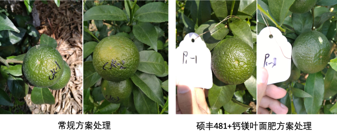 在雜柑的幼果膨大期使用天然蕓苔素+鈣鎂葉面肥能夠促進(jìn)樹體補(bǔ)充鈣元素,果面光靚,減少裂果產(chǎn)生,預(yù)防日灼果。小編推薦:雜柑幼果膨大期,使用天然蕓苔素碩豐481?2000倍+多迎鈣鎂1000倍噴霧。與常規(guī)方案處理相比,此方案處理,果實直徑大、果面光亮,日灼果發(fā)生概率降低30%。